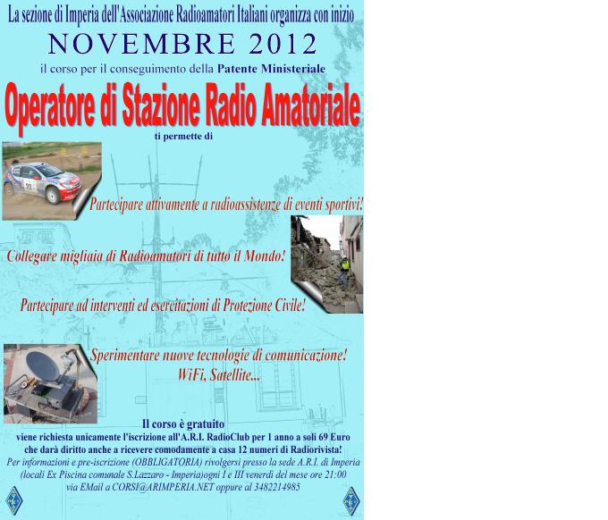 A Imperia presso la Sezione ARI a Novembre avrà inizio il corso per la preparazione agli esami ministeriali per il conseguimento della Patente Radioamatoriale. Per informazioni sull'iniziativa formativa e l'eventuale iscrizioni si può mandare una mail a corsi@arimperia.net oppure telefonare al 348 22 14 985 per lasciare in segreteria telefonica i dati per essere ricontattati.