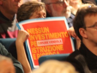 Vendola ha espresso loro la propria vicinanza e solidarietà auspicando che le istituzioni riescano a risolvere la problematica al più presto. In sala erano molti esponenti del PD locale tra cui Giuseppe Zagarella e Paolo Verda ma anche molte famiglie con bambini al seguito, studenti e pensionati. Primo a parlare un giovane studente universitario che ha lasciato poi la parola ad un professore universitario che ha illustrato a Vendola i motivi della protesta dei docenti in corso. Il Presidente della Puglia si è inizialmente soffermato sul tema della scuola pubblica e del modello berlusconiano. Vendola ha parlato anche dei diritti civili e delle elezioni di primavera.