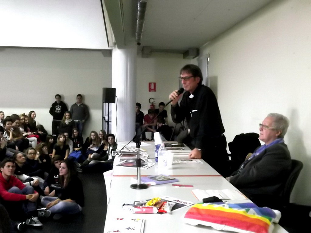 L'incontro è stato organizzato da Aifo, Apertamente e Libera. In apertura Susanna Bernoldi (Aifo) e Bruna Pizzi (Apertamente) tracciano un rapido profilo dell'autore e la Preside prof.ssa Grossi porge il benvenuto al relatore e ai ragazzi, lasciando poi la parola a Don Aniello, che tiene desta l'attenzione di tutti i presenti con la storia della sua missione ,delle sue difficoltà, dei suoi timori, ma anche delle sue iniziative e delle sue conquiste in un contesto difficile e pericoloso come quello di Scampia.