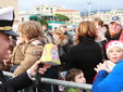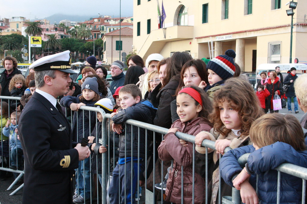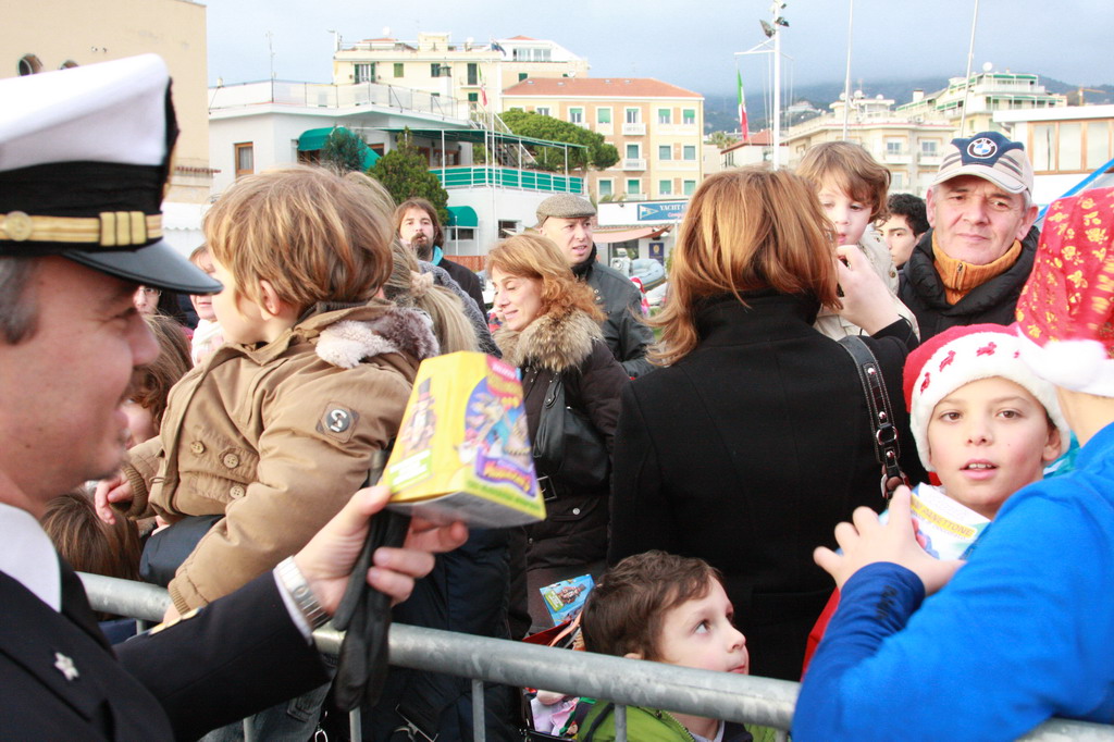 Fatto un breve giro del piazzale, la compagine si è poi impegnata nel consegnare un dolce regalo a tutti i bambini presenti, oltre che biglietti omaggio per le vicine giostre dei Giardini Vittorio Veneto per dedicarsi infine alle foto ricordo. Presenti sulla banchina oltre al comandante della capitaneria, il tenente di vascello Andrea Betti, anche Beppe Zaoli per lo Yacht Club di Sanremo, il consigliere comunale Simone Baggioli e Gianni Ostanel presidente della Confcommercio.