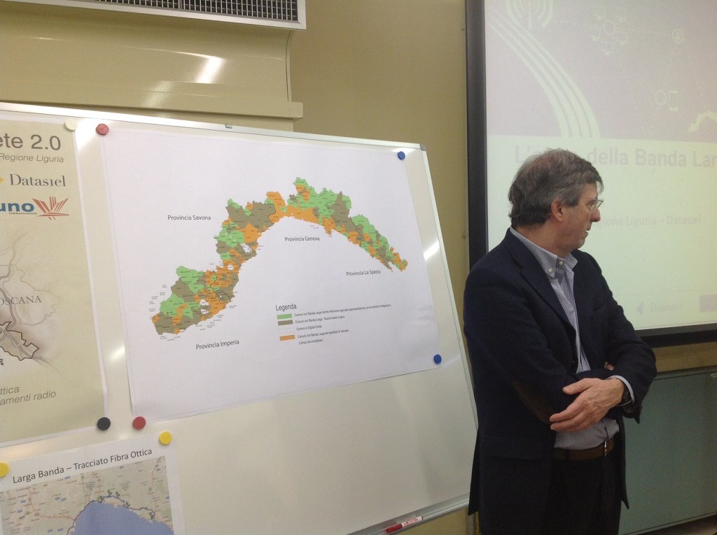 Abbiamo deciso di investire molte risorse, oltre 20 milioni di euro, in questo progetto proprio perché siamo convinti dell'importanza di portare internet ovunque. Il primo bando fatto dalle Province di Imperia e Savona non andò bene, nello scorso giugno la "Uno Communications" si è aggiudicata anche le Province di Imperia e Savona dopo quelle di Genova e Spezia. Nell'imperiese mancano i comuni di Prelà e Pietrabruna, i due non erano considerati zone in fallimento di mercato visto che un operatore privato aveva dichiarato la copertura ma così non è stato dunque saranno presto coperti.