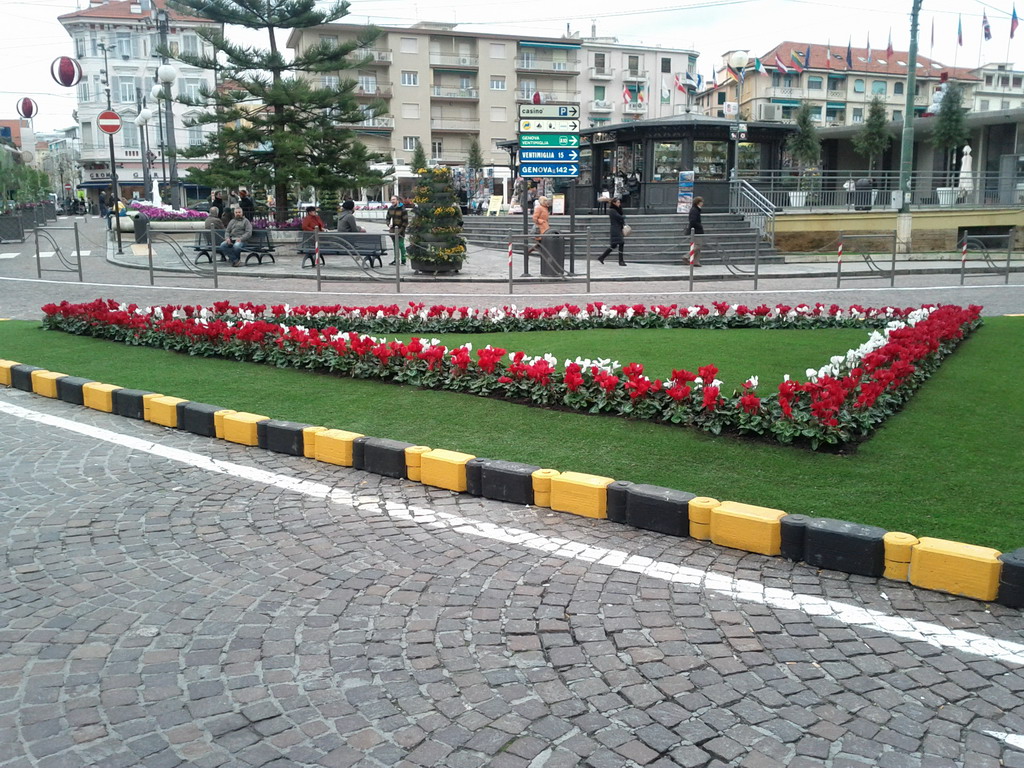 Sanremo: Ferrari parcheggiata a ridosso dell'aiuola in piazza Colombo, insoliti posteggi di una domenica sera