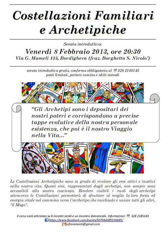 Venerdì 8 febbraio 2013, alle ore 20.30, in Via G. Mameli 135 a Bordighera (fraz. Borghetto S. Nicolò), si terrà una serata introduttiva gratuita all'introduzione al corso di Costellazioni Familiari e Archetipiche.