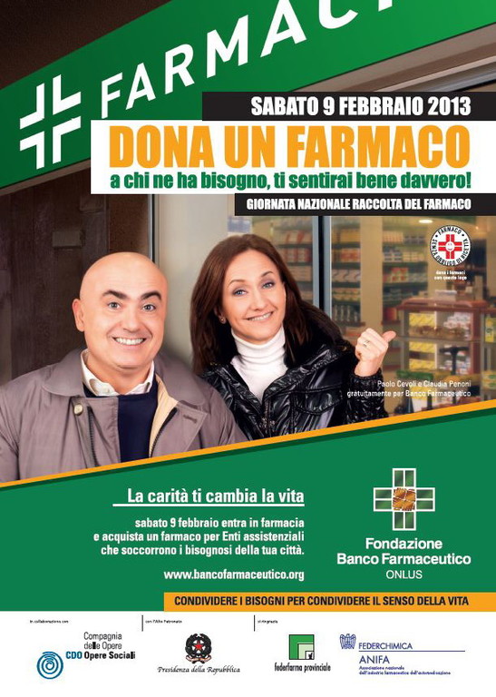 Sabato 9 febbraio, in oltre 3200 farmacie d'Italia, si terrà la XIII Giornata Nazionale di Raccolta del Farmaco, organizzata dalla Fondazione Banco Farmaceutico Onlus, un'associazione non profit nata a Milano nel 2000.