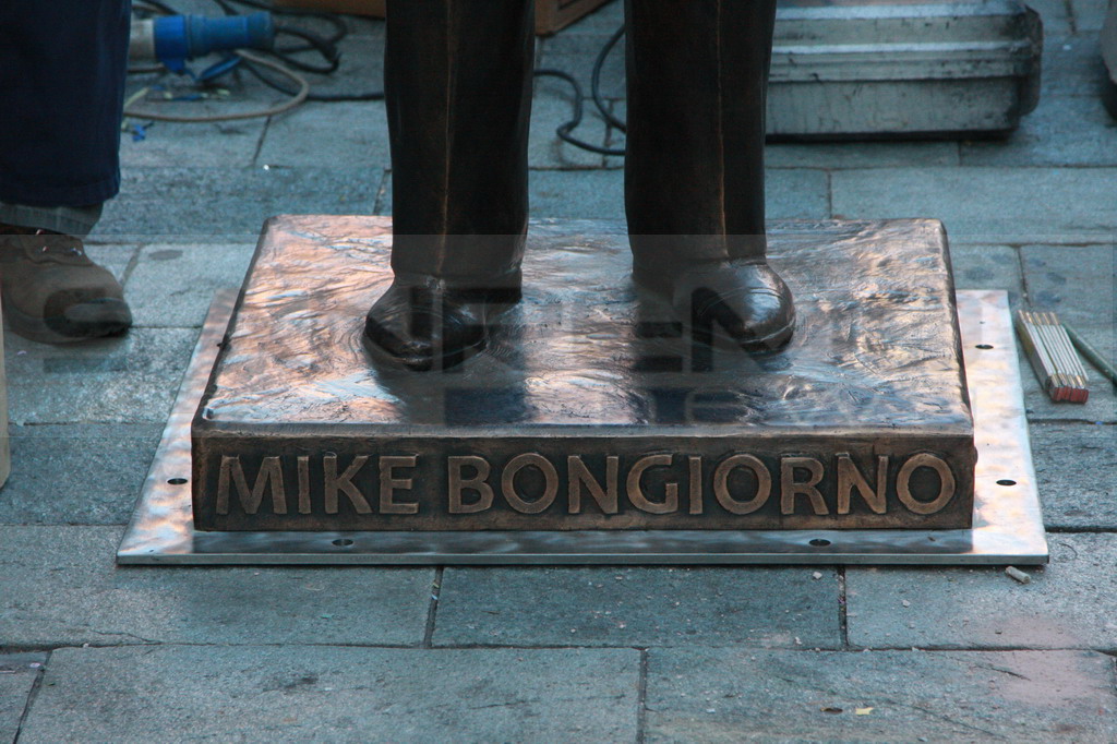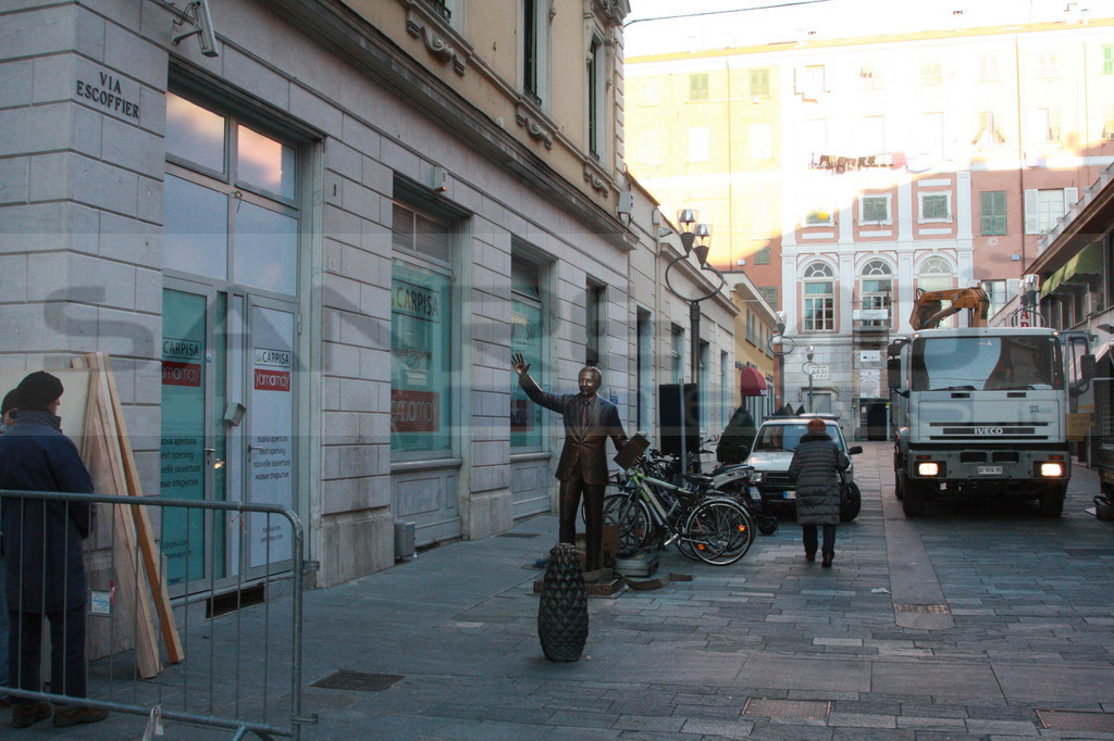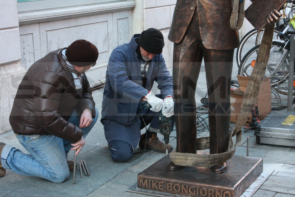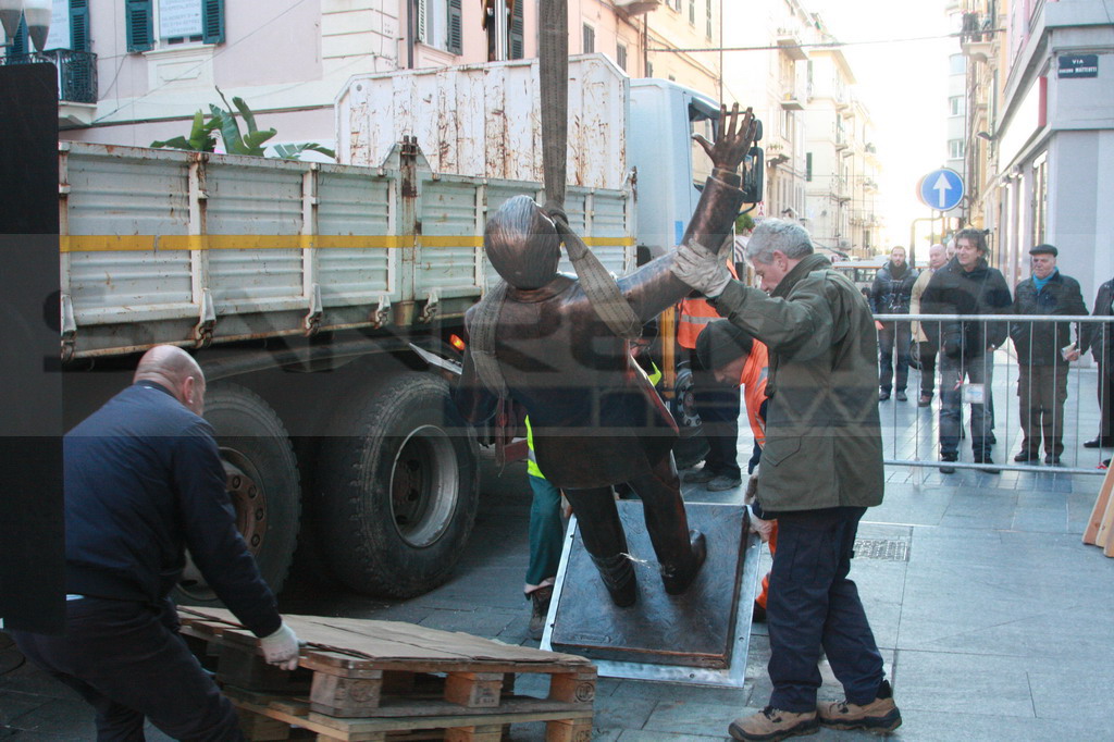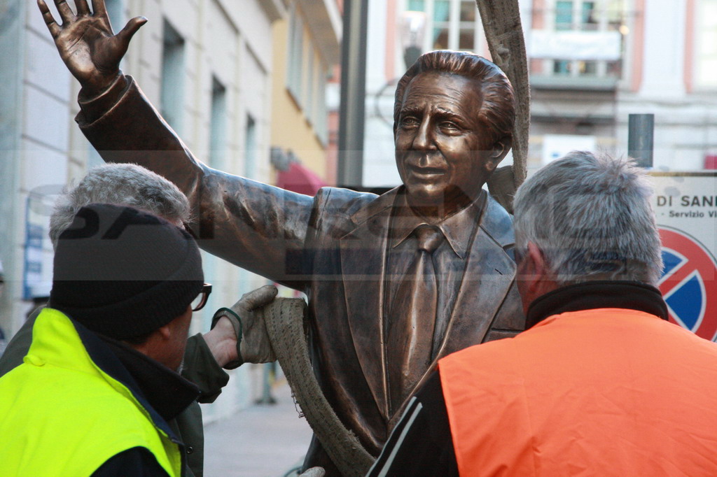 Intorno alle ore 8 la scultura è stata posizionata all'ingresso della via e dopo le varie prove, assessore e tecnici hanno optato per la collocazione laterale a sinistra con sguardo rivolto verso il mare. Questo monumento da oggi rimarrà lì in memoria del celebre personaggio mancato a Montecarlo l'8 settembre 2009. Lui era molto legato alla città dei fiori ed al suo Festival ed è stata un'idea della famiglia quella di mettere a disposizione questa statua, attraverso la fondazione Bongiorno.
