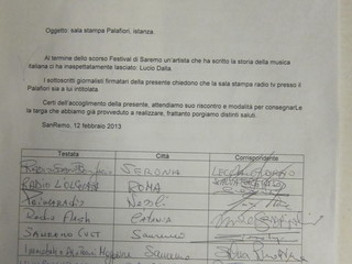 “Al termine dello scorso Festival di Sanremo un'artista che ha scritto la storia della musica italiana ci ha inaspettatamente lasciato: Lucio Dalla – si legge nell'istanza presentata dai giornalisti – i sottoscritti giornalisti firmatari chiedono che la sala stampa radio tv presso il Palafiori sia a lui intitolata”.