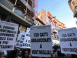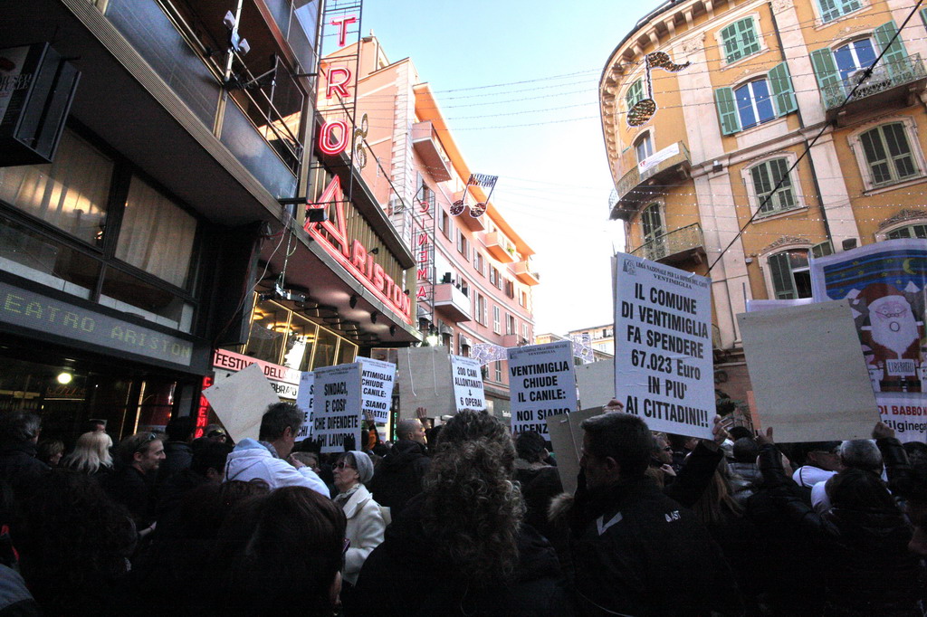 Manifestazione davanti al teatro Ariston di Sanremo, da parte della Lega Nazionale per la Difesa del Cane di Ventimiglia insieme ai dipendenti del canile della città di confine. Ad oggi con la chiusura ormai imminente della struttura di via Peglia sei persone perderanno il posto di lavoro. Loro infatti erano stati assunti grazie ad un contratto nato dalla convenzione tra la Lega ed i comuni che usufruivano del canile ventimigliese. Nel rifugio per animali, della città di confine trovano spazio 200 cani ed 80 gatti ma solo i primi saranno trasferiti a partire dal 1° marzo presso il canile di Poggio a Sanremo, gestito da privati.