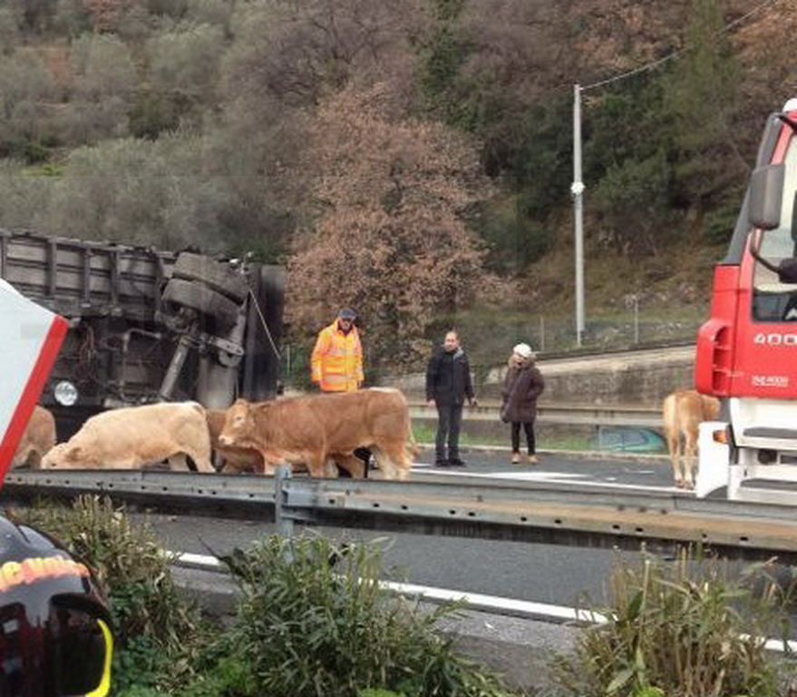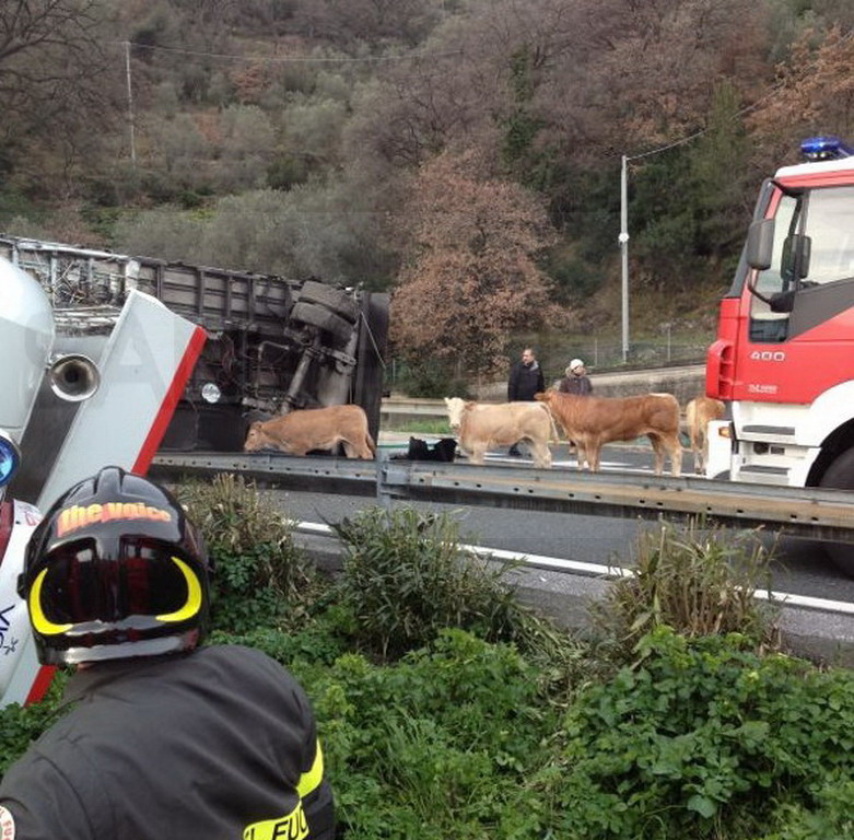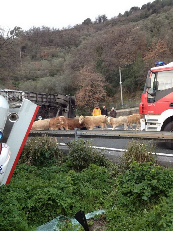 Camion ribaltato sull’A10 a Imperia: strage di bestiame, il bilancio è di decine di vitelli morti. Viabilità ripristinata in entrambi i sensi di marcia