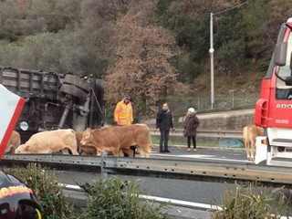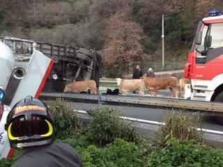 Camion ribaltato sull’A10 a Imperia: strage di bestiame, il bilancio è di decine di vitelli morti. Viabilità ripristinata in entrambi i sensi di marcia
