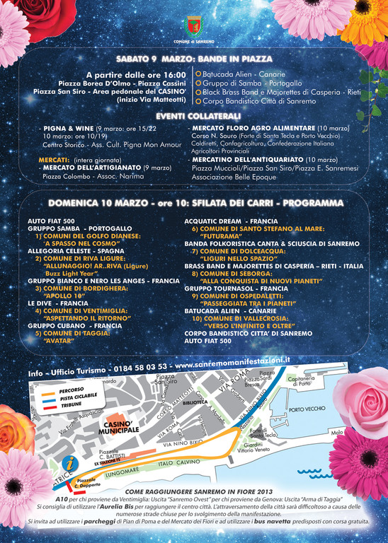 Sanremoinfiore è organizzato dall’Assessorato alla Promozione Turistica del Comune di Sanremo e sarà ripresa, come di consueto, dalle telecamere di RAI 1 con la diretta all’interno del programma “Linea Verde”.