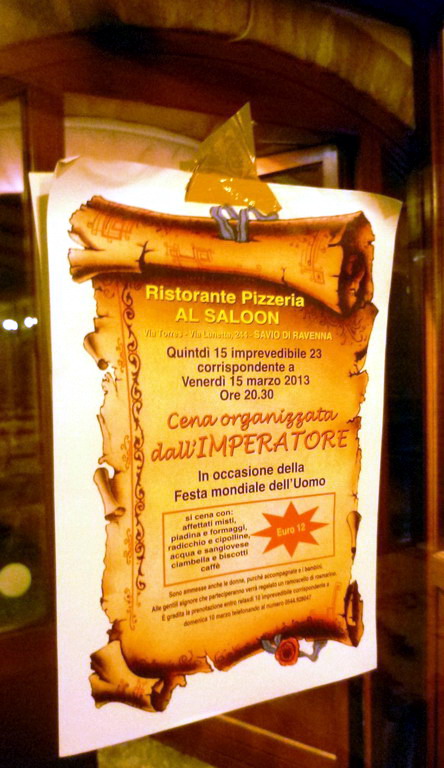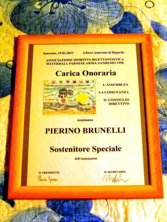 Nuova trasferta per AWF Arma-Sanremo e Libero Anarcato di Bajardo che sono infatti tornati a trovare l'Imperatore della Magna Romagna Pierino Brunelli reso noto dalla trasmissione 'Mai dire TV' negli anni '90. E se la fortunata esperienza della scorsa estate era stata più 'politica' in questo caso il gemellaggio ha avuto connotati prettamente sportivi. All'Imperatore è stata infatti donata la Carica Onoraria di Sostenitore Speciale dell'AWF Arma-Sanremo. La consegna è avvenuta in un ristorante nei pressi di Ravenna ed è stata effettuata dal Segretario Matteo Bianchini invitato dall'Imperatore alla sua festa del 15 Imprevedibile (15 marzo): 'Brunelli propone un suo calendario con nomi dei mesi modificati. Rivestono per lui una grande importanza il Primo Nebbioso (1 novembre) ed il 15 Imprevedibile (15 marzo) che delimitano un periodo da lui denominato Carnevale. Ci ha inoltre ricordato che il 15 marzo segna la data della morte di Giulio Cesare, personaggio da lui molto ammirato. E curiosamente non lontano dalla residenza 'imperiale' scorre anche il fiume Rubicone'.