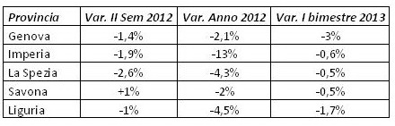 Analizzando i dati relativi alle province si vede come sia La Spezia a registrare il calo maggiore nelle quotazioni con una diminuzione pari al 2,6% da giugno a dicembre e del 4,3% nei dodici mesi. Se il primo bimestre del 2013 ha fatto registrare una battuta d’arresto nelle diminuzioni dei prezzi al metro quadro in quasi tutta la Liguria, la provincia di Genova sembra vivere ora la flessione che le altre hanno avuto nel 2012: nel territorio del capoluogo di regione i prezzi sono scesi da gennaio ad oggi del 3%, arrivando ad una media di 2.805 euro al metro quadro.