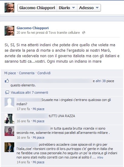 Diano Marina: Il sindaco "minaccia" il Governo indiano. "Se daranno la pena di morte o l'ergastolo ai due Marò, ogni minuto un indiano in mare".