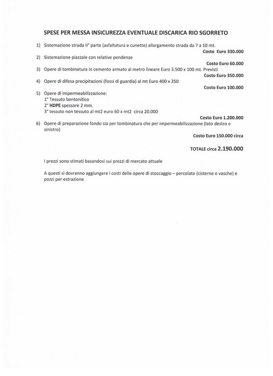 Sotto la lettera di Marco Lupi, la relazione ed i costi di realizzazione della discarica sul rio Sgorreto.