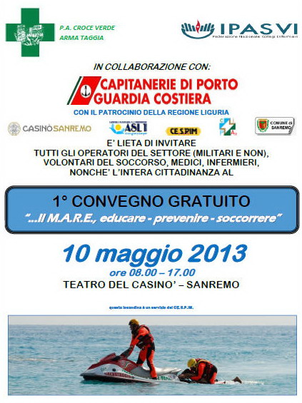 Si svolge venerdì 10 maggio, al teatro del Casinò di Sanremo, il 1° convegno gratuito organizzato dalla Croce Verde di Arma di Taggia sul tema ‘Il mare, educare, prevenire e soccorrere’.