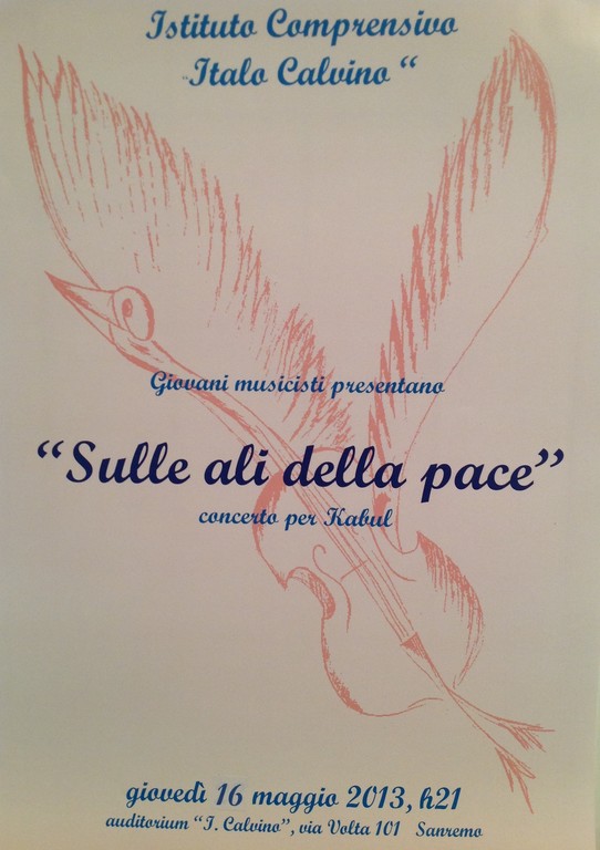 L’ istituto Comprensivo “I. Calvino” di Sanremo, organizza per giovedì 16 maggio, alle 21, presso l’ auditorium della stessa scuola, un concerto con gli alunni dell'indirizzo musicale. La serata prevede la proiezione di un video, sulla realizzazione del 'Giardino della pace e della speranza' per Kabul, che racchiude dentro di sè molteplici significati e simboli spirituali delle diverse religioni.