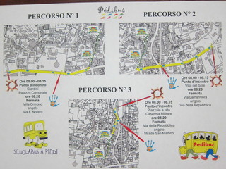 Come una sorta di autobus umano, il pedibus si snoderà lungo tre percorsi con partenza dalle 8 alle 8.15 da i giardini del palazzo comunale (e fermata Villa Ormond); Villa del Sole (con fermata via Lamarmora angolo via Repubblica) e piazzale a lato della caserma militare (con fermata della Repubblica angolo strada S.Martino). I piccoli alunni saranno dotati di gilet Pedibus e cappellini gialli e verranno accompagnati lungo il percorso da volontari (vigili, genitori e ufficiali di gara Aci).