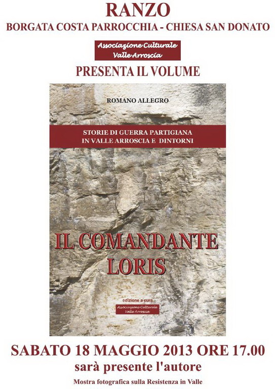L'associazione Valle Arroscia presenterà questo pomeriggio, sabato 18 maggio, alle ore 17.00, presso la Borgata Costa Parrocchia San Donato in Ranzo, il volume 'Il comandante Loris. Storie di guerra partigiana in Valle Arroscia e dintorni'.