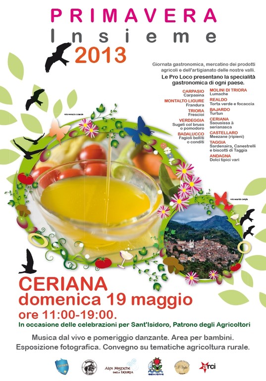 Passata la perturbazione di questa mattina, escono i primi raggi di sole, e tutto è pronto a Ceriana per l'edizione 2013 di "Primavera Insieme", l'evento ideato dalla ex Comunità Montana Argentina Armea che aveva ed ha il compito di promuovere i paesi delle Alpi Mistiche della Liguria attraverso le specialità gastronomiche di ogni Comunità. Insieme alle proposte culinarie (si va dalle lumache di Molini di Triora, alle Meezane di Castellaro, dai sugeli al bruss di Verdeggia, al ciousun di Bajardo, dai canestrelli di Taggia, ai fagioli di Badalucco, la Frandura di Montalto Ligue e moltissime altre specialità del territorio, tra le quali, ovviamente, non potrà mancare la Salsiccia di Ceriana, padrona di casa), l'evento di oggi propone anche un mercatino dei prodotti agricoli e artigianali, uno spazio per i bambini, una mostra fotografica e tante altre sorprese che consentiranno al visitatore di scoprire il borgo medievale di Ceriana. Nel pomeriggio, spettacolo musicale con i "Bruti e Boi", gruppo che propone la musica popolare della tradizione e degli autori liguri, in particolare genovesi. Ovviamente molto intenso anche il programma delle celebrazioni religiose in onore di Sant'Isidoro, Patrono degli Agricoltori: alle ore 11:00 Solenne celebrazione nella Chiesa Parrocchiale dei SS. Pietro e Paolo. A seguire processione per le vie del paese e benedizione degli agricoltori e delle campagne. Per tutta la giornata funzionerà il consueto servizio navetta che collegherà al parcheggio sito nel campo sportivo.