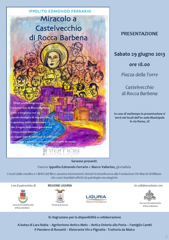 Il libro verrà presentato ufficialmente il 29 giugno alle ore 18.00 in Piazza della Torre a Castelvecchio di Rocca Barbena (www.castelvecchiodiroccabarbena.eu) in provincia di Savona e i diritti d'autore verranno devoluti a favore della Fondazione Luigi De Marchi di Milano che si occupa di bambini con problemi oncologici ed epatopatici (www.fondazionedemarchi.it).