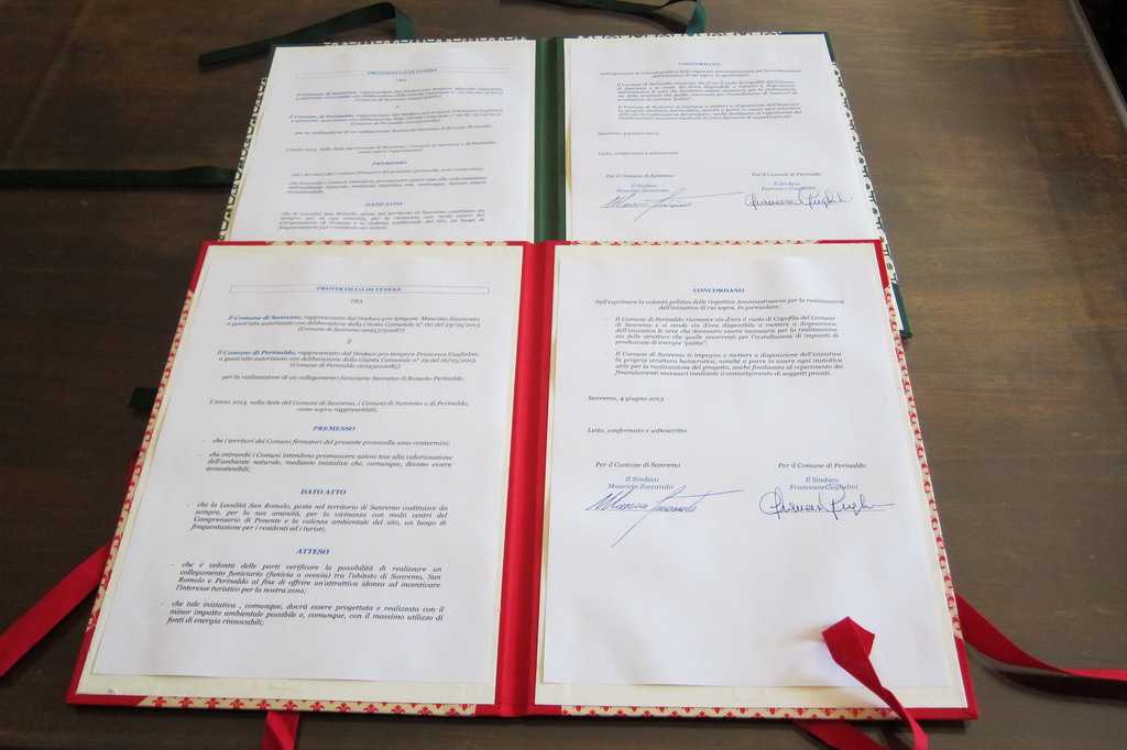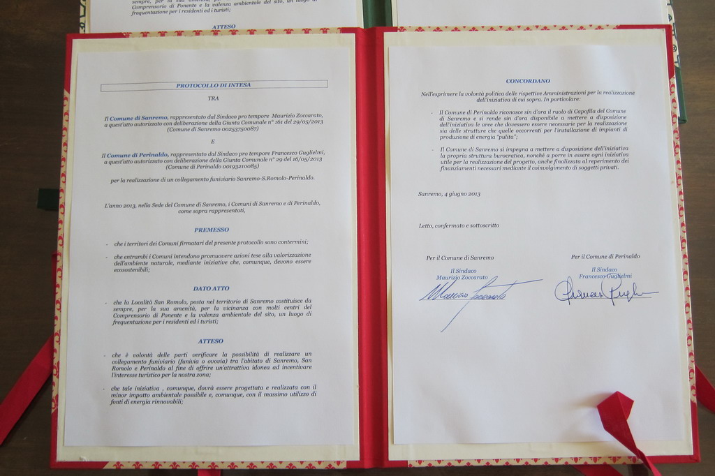 L'atto sancisce la volontà politica delle due amministrazioni a realizzare questo ambizioso progetto consistente nel collegamento funiviario tra l'abitato di Sanremo, San Romolo e Perinaldo. Quello della funivia è infatti un sogno da sempre rimasto nel cuore dei sanremesi che potrebbe unire mare ed entroterra rilanciando il turismo in un'ottica di sostenibilità ambientale.