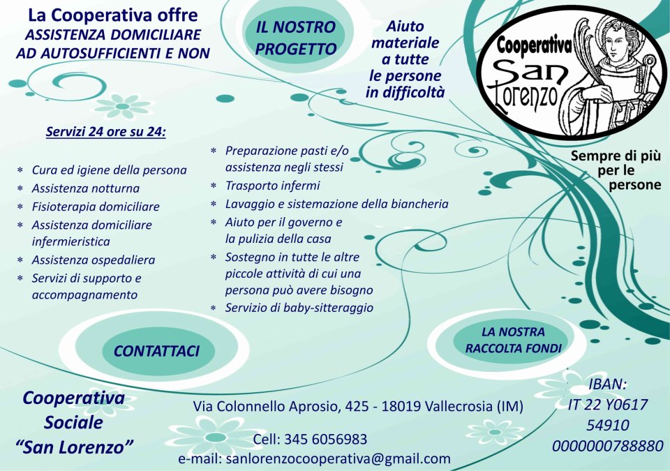 Da un gruppo di volontari di ispirazione cattolica, che hanno a cuore le persone più bisognose, è nata a Vallecrosia ‘San Lorenzo Coop Sociale', una nuova cooperativa, con sede in Via Col. Aprosio 425, rivolta al sociale.
