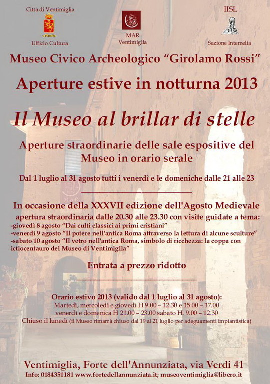 In tali occasioni sarà possibile usufruire di visite guidate tematiche che permetteranno di scoprire la storia e le caratteristiche dei reperti esposti. Il Museo offrirà durante l'estate anche la possibilità di partecipare, su prenotazione, ai laboratori didattici aperti ai più giovani (dai 6 ai 14 anni), residenti e turisti, per attività ludico-istruttive ispirate dal percorso museale. In occasione delle serate di Mediestate dall'8 al 10 agosto prossimo, organizzate dall'Ente Agosto Medievale, il Museo aprirà le proprie sale in orario serale dalle 20.30 alle 23.30 organizzando per ogni appuntamento una specifica visita guidata a tema: giovedì 8 agosto, 'Dai culti classici ai primi cristiani', venerdì 9 agosto, 'Il potere nell'antica Roma attraverso la lettura di alcune sculture' e Sabato 10 agosto, iIl vetro nell’antica Roma, simbolo di ricchezza: la coppa con ictiocentauro del Museo di Ventimiglia'. Il Museo rimarrà chiuso per aggiornamento impianto didascalico dal 19 al 21 luglio.