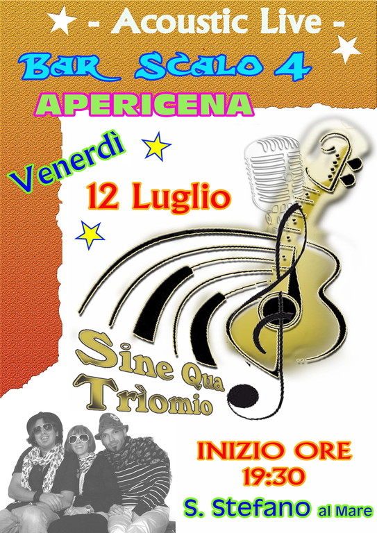 Venerdì la band acustica "Sine Qua Triomio" allieterà l'aperitivo del Bar Scalo 4 sulla pista ciclabile a Santo Stefano al Mare. I "Sine Qua Triomio" si esibiranno a partire dalle 19.30 nel caratteristico dehor. In questo caratteristico locale si esibirà la formazione di sempre ovvero, Lara alla Voce, Max al Piano/Fisarmonica ed Emax alla Chitarra. Proporranno un repertorio di pezzi cover riarrangiati e filtrati dalle loro esperienze musicali.