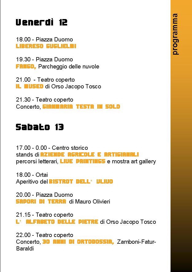 La seconda giornata del .diFfest , sabato, inizierà alle 17 nel centro storico di Badalucco. Piazza Duomo ed alcune delle bellissime stradine che rappresentano il cuore del Paese, saranno invase pacificamente da stands di aziende agricole e artigianali locali, pittrici in performance e lavorazione terraglia artistica. Alle 18 appuntamento a Ortai per il leggendario Bistrot dell’Ulivo. Ideato da Franco e Rossella Boeri ROI. Alle 20 il celebre designer Mauro Olivieri ci introdurrà ai Sapori di Terra, offrendoci la possibilità di capire come buona parte del futuro, design compreso, porrà le proprie basi nella tradizione e nell’artigianato. Alle 21 ci si sposterà nuovamente al Teatro coperto per un nuovo reading di Orso Jacopo Tosco dal titolo “L’alfabeto delle pietre”. Alle 21 l’imperdibile finale del .diFfest: 30 Anni di Ortodossia dai CCCP all’estinzione. Massimo Zamboni, mente e cuore dei CCCP la più importante band dell’underground italiano, accompagnato dallo storico performer Fatur, da Angela Baraldi, musicista e attrice dal talento viscerale, e dalla loro band, riproporranno i capolavori che hanno contrassegnato trent’anni di carriera, segnando in maniera indelebile la scena musicale del nostro paese.