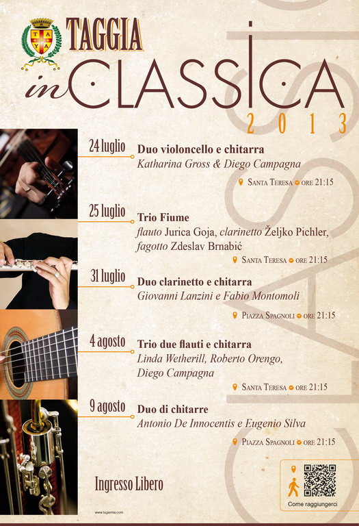 "Con questa manifestazione - afferma Roberto Orengo assessore alla programmazione turistica del comune di Taggia - si intende proseguire sulla presentazione di concerti di musica da camera che, dopo i successi passati, concedono l'opportunità di ascoltare musicisti di assoluto livello internazionale e di poter vivere e conoscere meglio il nostro meraviglioso centro storico".Per tutti coloro che fossero interessati raggiungere Santa Teresa insita nel centro storico potrà farlo più comodamente attraverso la lettura, mezzo smartphone, del qrcode posto sul manifesto della rassegna!