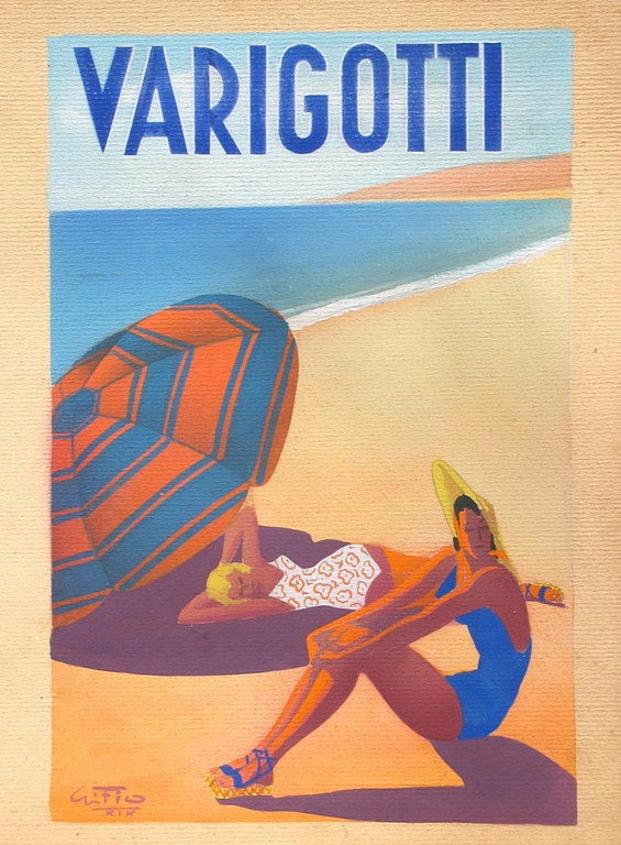 Qualche notizia sull'artista: "Gino Fiore, in arte Gifio, ligure d’adozione – nasce a Napoli nel 1907 ma sin da bambino vive nella riviera di ponente e dagli anni Cinquanta risiede ad Alassio, dove scompare nel 1992 -, Gifio è pittore ed è anche disegnatore, cartellonista, caricaturista, ceramista e tanto altro ancora. Inoltre, per un lungo tratto della sua vita, secondo la diretta testimonianza degli amici ed estimatori è un autentico bohémien. Nel corso della sua lunga attività, infatti, Gifio si dedica sia alla pittura tradizionale, esprimendo una predilezione per i temi paesaggistici, sia alla ricerca di nuovi mezzi espressivi e tecnici: dai suoi esordi nel Futurismo italiano con Marinetti per arrivare alle parate carnevalesche popolate dalle sue grandi sculture caricaturali di cartapesta, ai bassorilievi di cemento che decorano i palazzi di Alassio e della provincia, ai manifesti pittorici che per diverso tempo promuovono l’immagine delle città del ponente.