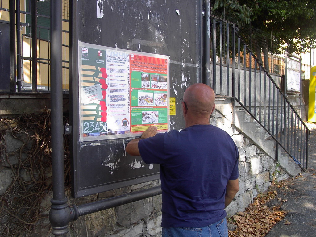Le locandine sono state affisse tramite i Volontari appartenenti al Gruppo Comunale di Protezione Civile e AIB negli spazi istituzionali presenti nelle frazioni del territorio comunale, esposte maggiormente al rischio di incendio boschivo e di interfaccia; i pieghevoli verranno distribuiti, sempre tramite i Volontari appartenenti al Gruppo Comunale di Protezione Civile ed AIB, in attività commerciali, locali ricreativi e ritenuti strategicamente importanti sia dal punto di vista dell'esposizione al rischio che della quantità di persone con cui venire a contatto, oltre che alle manifestazioni culturali-turistico-commerciali a cui questo Gruppo parteciperà svolgendo azione di supporto.
