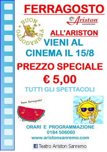 Speciale promozione 'Ferragosto al Cinema'. Il 15 agosto nelle sale di Sanremo e Vemtimiglia ingresso a prezzo ridotto al cinema a 5 euro per tutti gli spettacoli.
