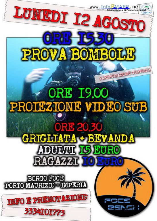 Dalle 15.30 tutti quelli che lo vorranno potranno, dopo una breve spiegazione tecnica sulle attrezzature subacquee, provare le bombole da sub e i più piccoli potranno respirare con l'erogatore. Per partecipare bisogna recarsi alla spiaggia della Foce a Porto Maurizio dopo le 15.30 con l'attività che è gratuita ed è rivolta a tutti (bambini e adulti).