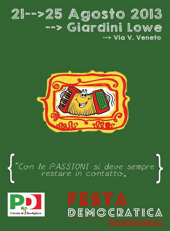 Inizia stasera alle 18 l'edizione 2013 della Festa Democratica di Bordighera. Un ricco programma di incontri, musica popolare, e come da tradizione, il ristorante all'interno della splendida cornice dei Giardini Lowe di Bordighera in via Veneto.
