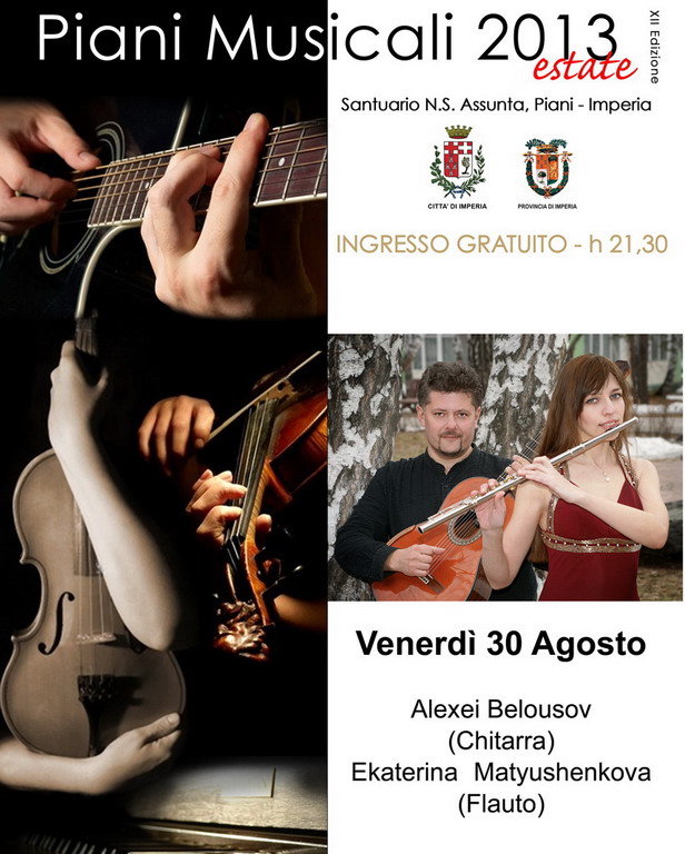 Venerdì 30 agosto si svolgerà una appendice estiva della 12a edizione di 'Piani Musicali' ad Imperia. Si esibiranno Alexei Belousov alla chitarra ed Ekaterina Matyushenkova, al flauto.