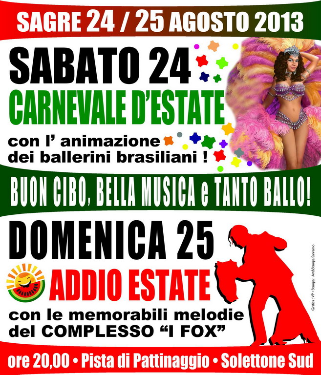 Sabato e domenica prossimi la Pro Loco 'Città di Vallecrosia' organizzerà le due ultime sagre dell’estate 2013. Nel solito contesto della Pista di Pattinaggio, sul Solettone sud di via Colombo i componenti dell'associazione della 'Città della Famiglia', si impegneranno ancora una volta per far divertire i residenti ed i turisti all’insegna della buona tavola e del divertimento.