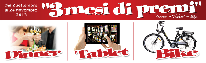 Tutti coloro che acquisiranno in una unica soluzione ticket slot machine non convertibili per un valore di €100,00 riceveranno la cartolina per partecipare all’estrazione di 1 bicicletta elettrica Modello MTB Dolomites. Invece chi acquisirà in un’unica soluzione ticket non convertibili per un valore di €20 parteciperà all’estrazione dei tre Tablet,: n.1 tablet Ipad retina 32 Gb, n.1 Tablet Ipad mini 32 Gb e n.1 tablet Samsung Galaxy Note 10.1. Infine urne per vincere 12 cene per due persone sulla terrazza sotto le stelle della casa da gioco per chi punterà con ticket non convertibili del valore di €10.