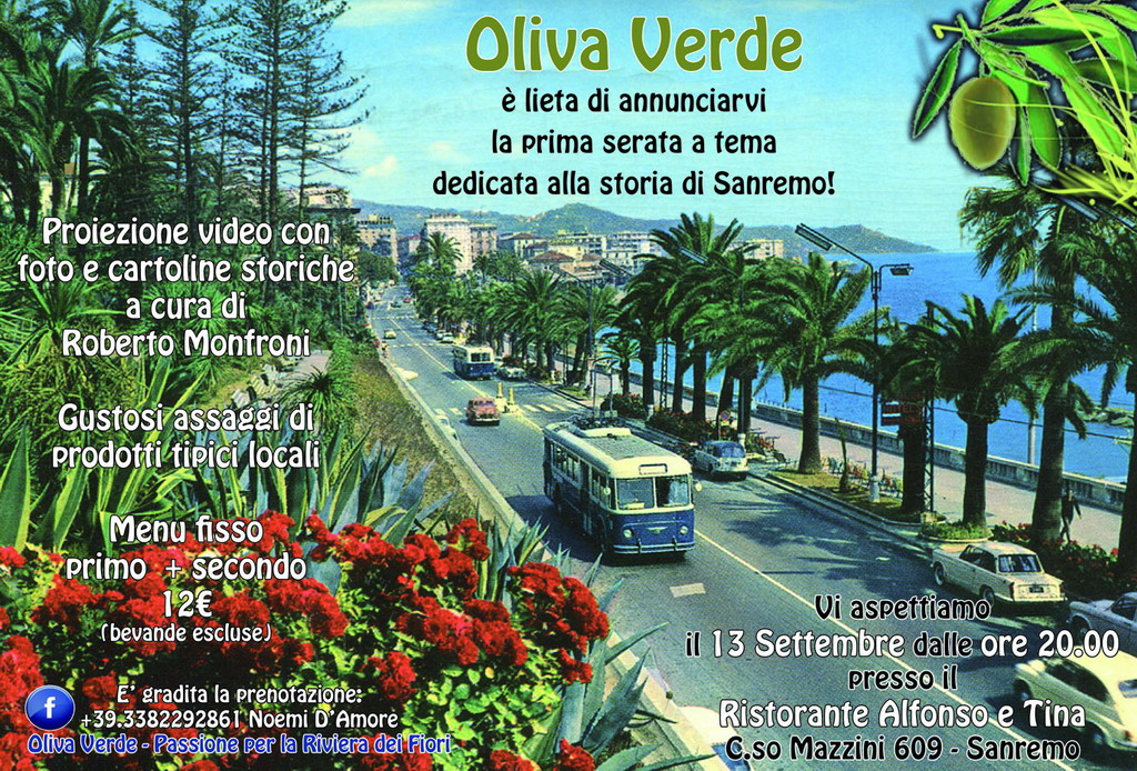 Così ad oggi si possono contare oltre 1000 appassionati della Riviera e sul blog ben 3000 visite, dati che lasciano intendere come i ponentini siano legati alla propria terra e alla propria cultura! Proprio per queste ragioni, "Oliva Verde" vuole fare un passo avanti, coinvolgendo i cittadini non solo virtualmente, bensì personalmente con una serata dedicata esclusivamente alla città dei fiori: Sanremo. Un percorso culturale tra le antiche vie di una città che in nemmeno un secolo ha cambiato completamente volto, grazie ad una documentazione video che mostrerà l'evoluzione storico-urbanistica di Sanremo permettendo ai cittadini di conoscere qualcosa di nuovo o forse qualcosa da sempre esistito, ma che non si è mai notato! Inoltre, per non farsi mancare nulla, sarà possibile deliziare il palato con l'assaggio dei più noti prodotti tipici locali e sedersi a tavola in compagnia per gustare un'ottima cena! Insomma, una serata dove fare il pieno di cultura e non solo.
