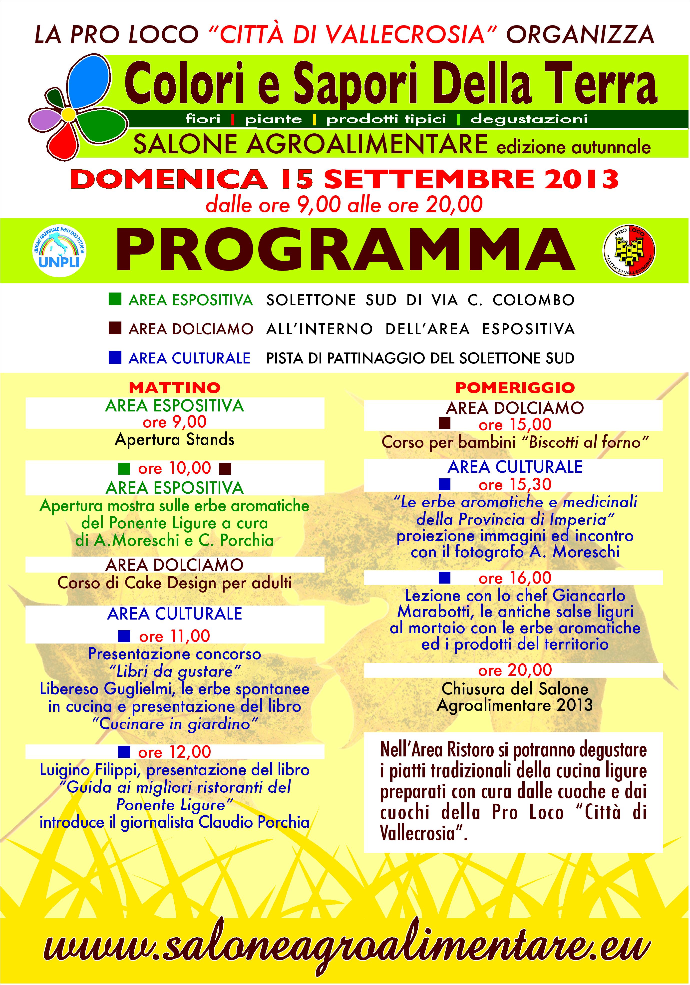 9.00-20.00. ‘Colori e Sapori della Terra’: salone agroalimentare con mostre, corso di cake design, presentazioni libri, prodotti tipici, degustazioni, animazioni per bambini (a cura della Pro Loco di Vallecrosia) Solettone Sud (per leggere il programma nel dettaglio cliccare questo link)