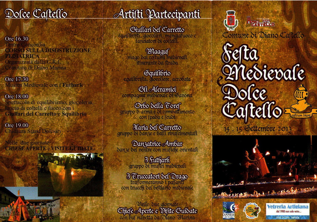 Tutti i dolci sono preparati dalle“casalinghe pasticcere” e il menù spazia dai classici, come frittelle di mele,krapfen, salame dolce e pastiera fino ai più originali, come l’ ultima creazione: “la torta al basilico”. L’ intero ricavato andrà a favore della ONLUS “Madian Orizzonti”, una organizzazione no profit dell’ordine dei Religiosi Camilliani, che da anni si occupa di reperire fondi per Haiti. Durante la giornata sono previsti spettacoli vari di equilibrismo con i “Giullari del Carretto” e “Squilibrio”. Presso il Teatro Concordia si terranno inoltre un Corso sulla Disostruzione Pediatrica, organizzato dalla C.R.I. di Diano Marina (due appuntamenti rispettivamente alle ore 10,00 e alle ore 16,30) e alle ore 15 un dibattito sull’ alimentazione e prevenzione dei tumori a cura della L.I.L.T. di Sanremo – Sezione di Imperia.