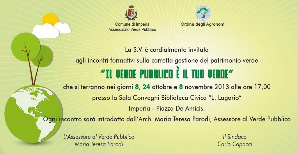 “Ricordati il verde pubblico è il tuo verde, rispettalo!”. Parte proprio da questo slogan, l'iniziativa “Il Verde Pubblico è il tuo Verde”, promossa dall'Assessorato al Verde Pubblico e dall'Ordine degli Agronomi che propongono, presso la Sala Convegni della Biblioteca Civica “Leonardo Lagorio” in piazza De Amicis, una serie di incontri formativi sulla corretta gestione del patrimonio verde. Tema centrale del primo incontro di martedì prossimo alle 17) “La vegetazione in città” intesa come un valore e un bene di tutti da difendere e valorizzare.