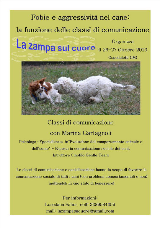 Sabato 26 e domenica 27 ottobre, La Zampa sul Cuore organizza ad Ospedaletti "classi di comunicazione per cani con problemi comportamentali e relazionali e per la buona e corretta socializzazione di tutti i cani", con Marina Garfagnoli Psicologa, Specializzata in "Evoluzione del comportamento animale e dell'uomo".