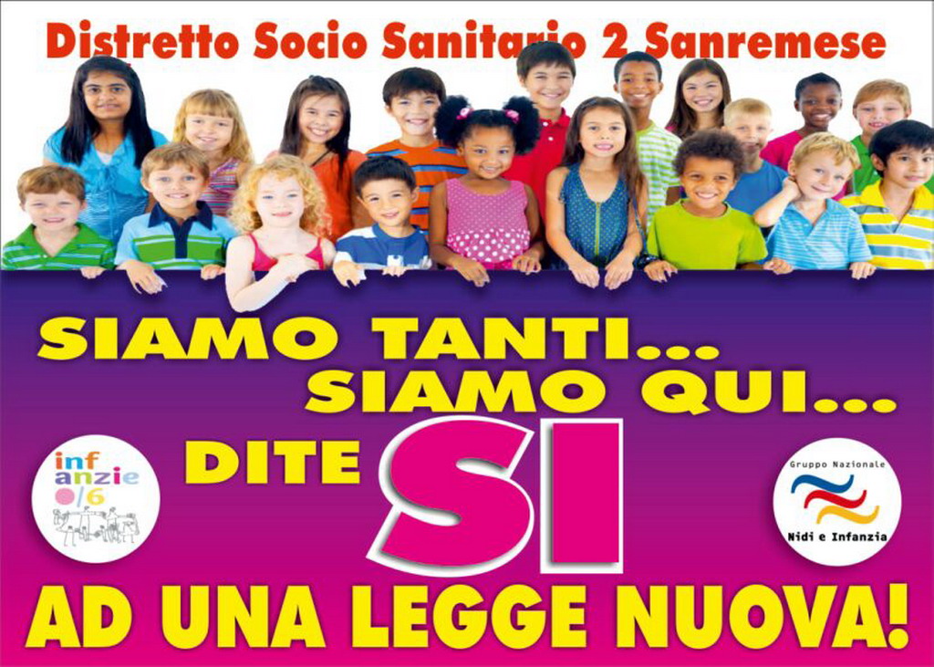 Per il terzo anno consecutivo il gruppo nazionale nidi infanzia, in collaborazione con i gruppi territoriali, domenica 1° dicembre promuove, in tutte le piazze d’Italia, un'iniziativa per mobilitare l'attenzione dei politici, degli amministratori, dei dirigenti, dei coordinatori, educatori, operatori, genitori, nonni, insegnanti sulla necessità di una nuova legge nazionale. Anche i servizi educativi delle sedi di Sanremo, Ospedaletti, Taggia, Riva Ligure (coordinatrice dr.ssa Patrizia Lanzoni) hanno aderito all’iniziativa promuovendo un FLASH MOB, che scatterà in piazza Borea d’Olmo, alle 10.44 (a richiamare il numero dell'attuale vecchia legge nazionale sui nidi, la 1044/71).