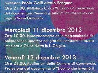 Venerdì 13 dicembre alle 21,presso l'Auditorium della Camera di Commercio di Imperia, la proiezione del documentario “L'uomo che inventò il materiale che Dio si era dimenticato di creare. A seguire una conversazione con Settimio Benedusi (fotografo), Giovanni Spalla (architetto), Marco Ferreri (architetto e designer), Stefano Senardi (discografico e realizzatore di eventi).
