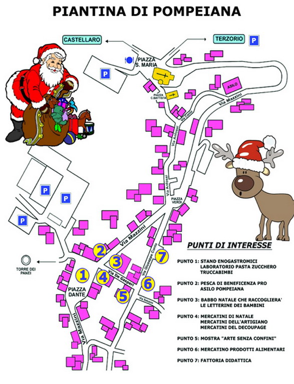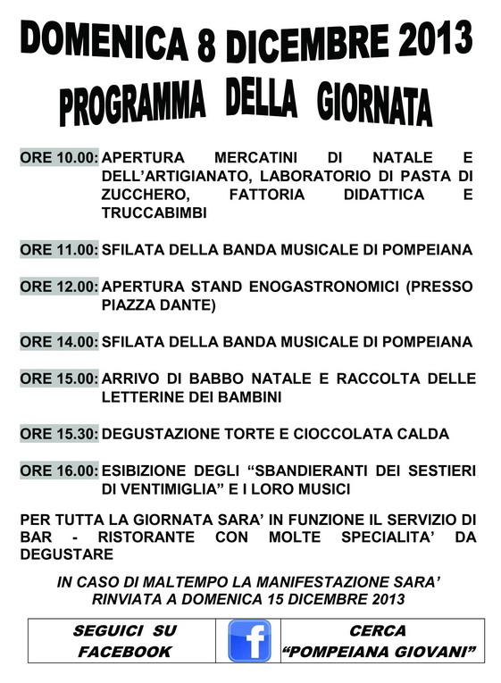 A partire dalle 10.00 del mattino saranno allestiti i banchi degli espositori, degli artigiani, e degli standisti dei prodotti gastronomici per le vie del paese. Partendo da Piazza Dante - la piazza principale del paese – il percorso espositivo si snoderà attraverso i carruggi più tipici e gli scorci più suggestivi di Pompeiana. Le attrazioni previste durante la giornata, saranno dedicate principalmente ai più piccoli. Sarà organizzato un laboratorio per la lavorazione della Pasta di Zucchero, si potrà interagire con gli animali della “Piccola Fattoria” e mascherarsi con “Truccabimbi”, si potrà ascoltare la banda di Pompeiana che per l’occasione diventerà quella dei “Babbi Natale” e alle 15:00 si assisterà a l’arrivo in calesse di Babbo Natale con la lettura delle “Letterine” a lui indirizzate e distribuzione di cioccolata calda.