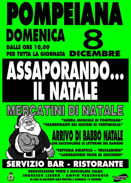 Domenica a Pompeiana, per la seconda volta, si terrà l'appuntamento con “Assaporando il Natale”, manifestazione nata con l’intenzione di creare un momento di aggregazione per le vie di Pompeiana a pochi giorni dal Natale. L'iniziativa è stata organizzata dall’Ass. culturale “Pompeiana Giovani”, in collaborazione con il Comune di Pompeiana ed un gruppo di cittadini volontari appartenenti alla quotidianità del paese.