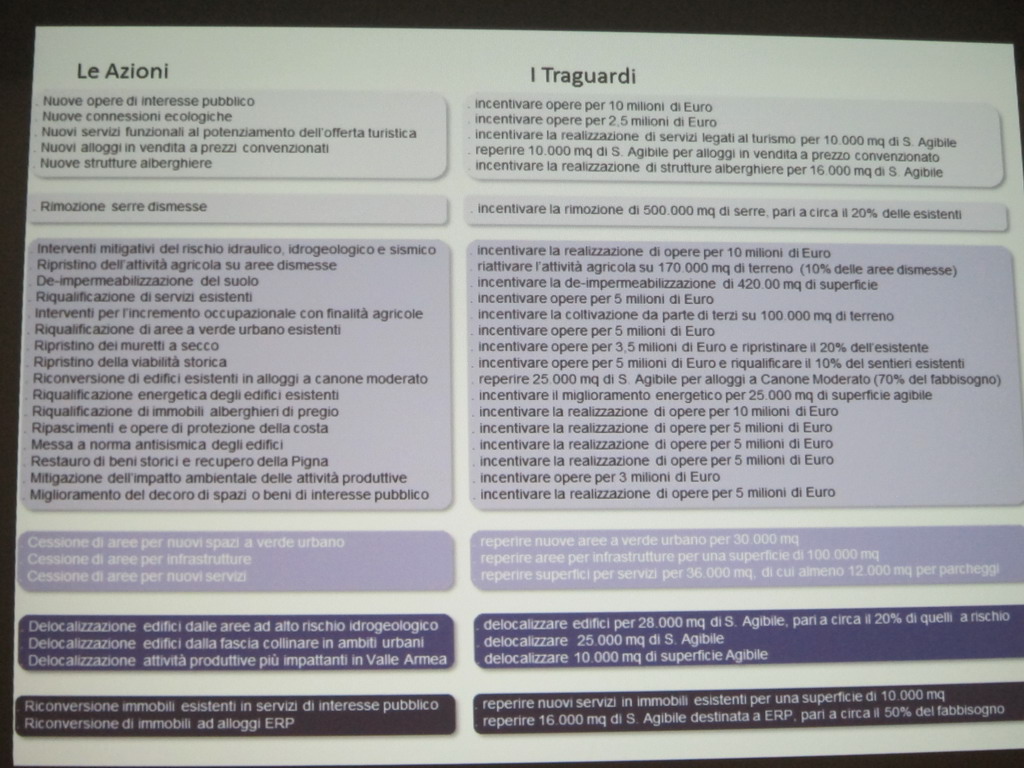 “Sanremo non può permettersi una sperequazione di questo tipo e il Puc si fa carico di migliorare la sua crescita insediativa e l'organizzazione degli spazi – aggiunge l'arch. Andrea Cavaliere incaricato allo studio V.A.S. e valutazione azioni premiali – La questione delle serre dismesse per esempio (circa 500 mila mq da rimuovere ndr) non è solo un problema di qualità di paesaggio ma di rischio idrogeologico, così come l'impermeabilizzazione dei suoli e la cementificazione lo è per la stabilità dei versanti”.