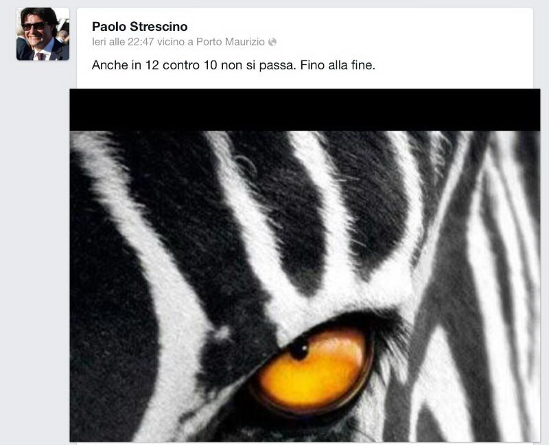 Caduta di stile da parte del presidente del consiglio comunale di Imperia Paolo Strescino, che nel proprio profilo Facebook ha scritto "Anche in 12 contro 10 non si passa. Fino alla fine". L'allusione era riferita alla partita di calcio pareggiata dalla Juventus (sua squadra del cuore) in casa della Lazio per 1-1, in cui è avvenuta l'espulsione del portiere bianconero Buffon, reo di aver commesso una "condotta gravemente sleale" che, oltre al rigore, da regolamento comporta automaticamente anche un cartellino rosso.
