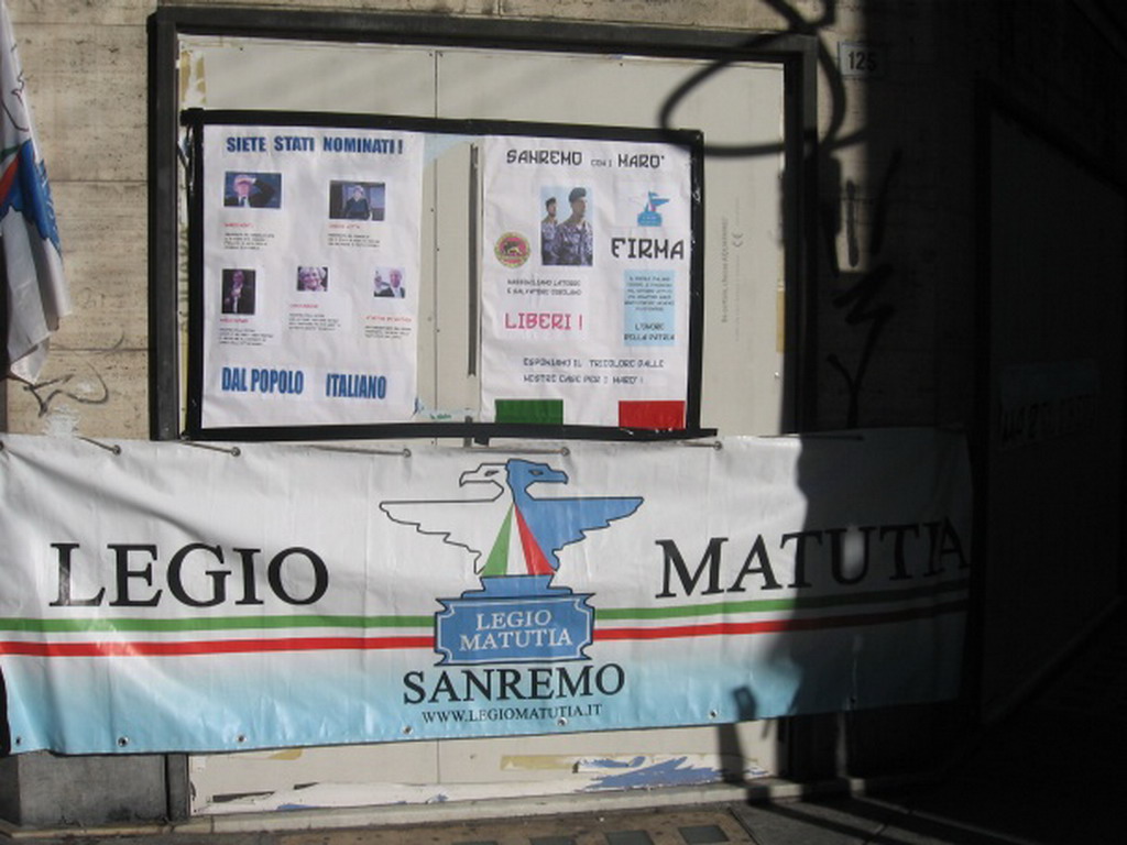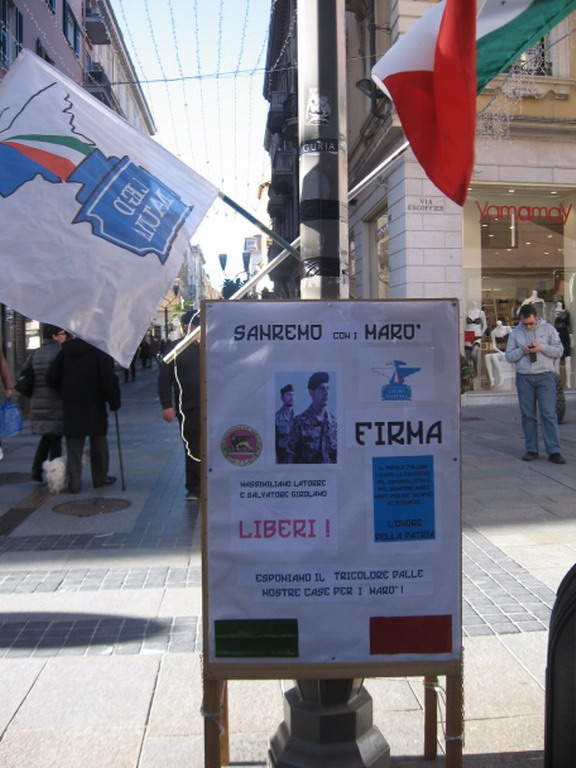 Grande successo ha riscosso l'iniziativa della Legio Matutia col banchetto allestito ieri in via Matteotti a Sanremo. La raccolta firme in sostegno dei nostri marò trattenuti in India ha trovato il consenso di sanremesi e turisti che hanno manifestato la loro solidarietà per i due militari italiani ormai da due anni 'dimenticati' dal Governo.